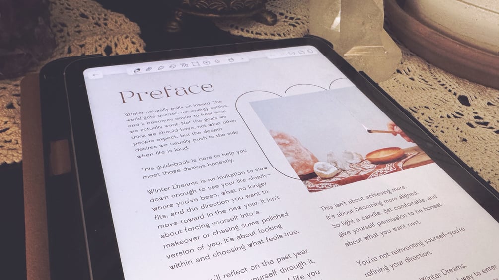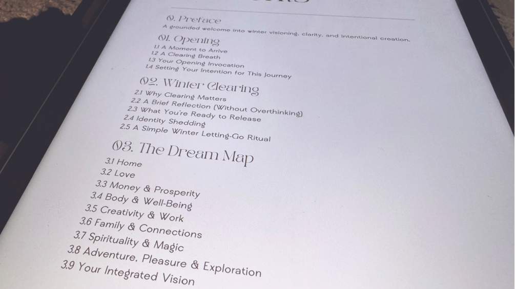 Winter Dreams is a 60+ page guided workbook that helps you move through December and January with intention, clarity, and inner alignment — without pressure, forced positivity, or “new year, new you” energy.